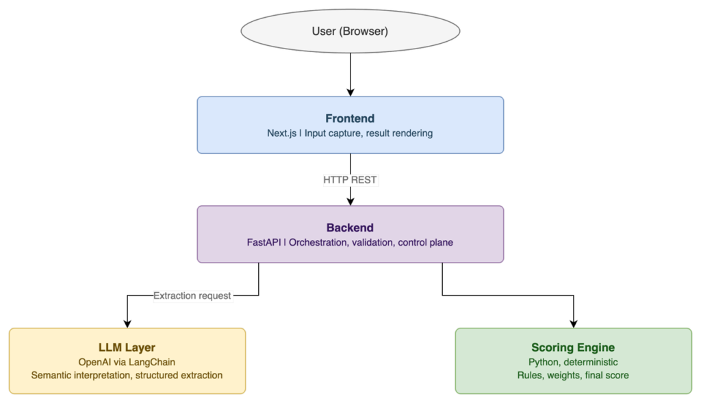 The backend is the system’s control plane. It receives requests, validates and normalizes inputs, orchestrates calls to the LLM, and then passes the structured output to the scoring engine. It enforces the boundary between what the LLM is allowed to decide and what the deterministic engine decides.