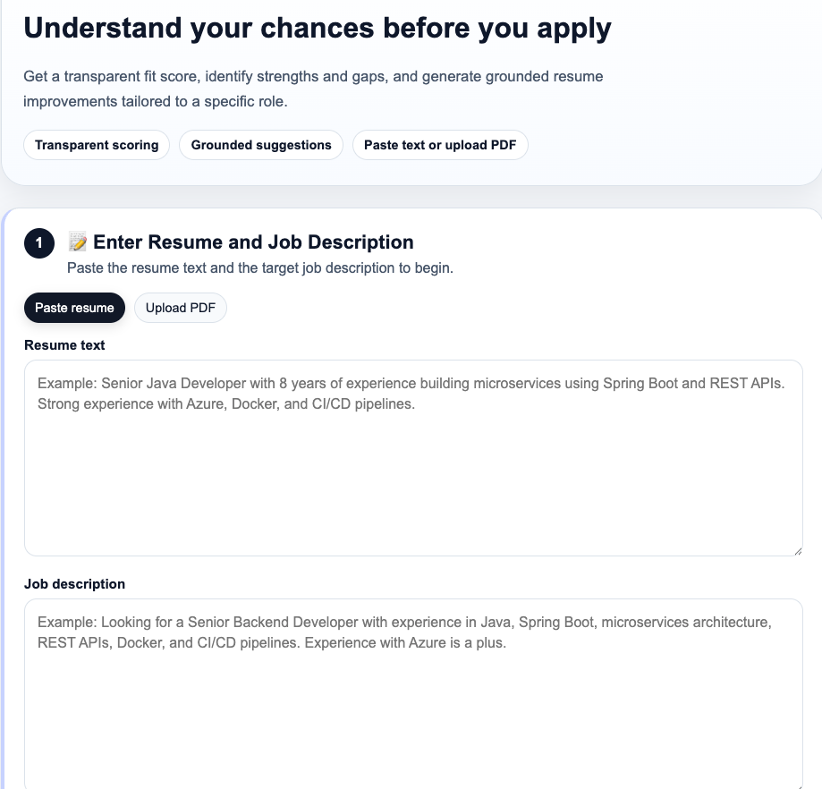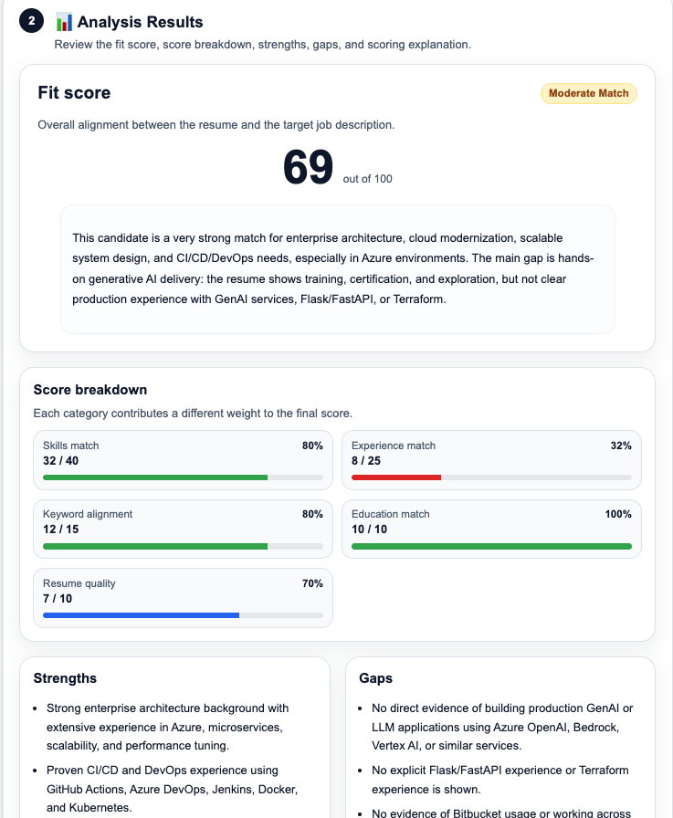 You provide a resume, either as pasted text or as a PDF, along with a job description. The tool processes both inputs, analyzes the match across multiple dimensions, and returns a result that includes a numerical fit score, a breakdown of how that score was computed, a list of strengths and gaps, and concrete suggestions for improving the resume.