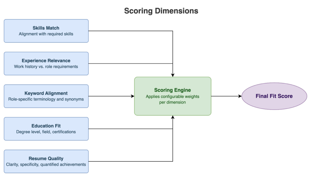 The scoring engine evaluates fit across five dimensions, each with its own weight: